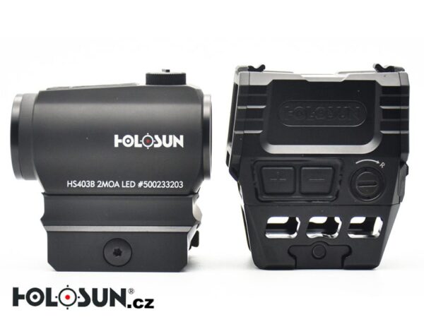 Tento kolimátor patří do nejvyššího segmentu značky HOLOSUN. Nalezneme zde solární panel, automatické vypnutí a probuzení pohybem. Osnovu lze přepínat mezi: tečkou 2 MOA, tečkou + obrazcem 65 MOA nebo lze zvolit pouze obrazec 65 MOA.